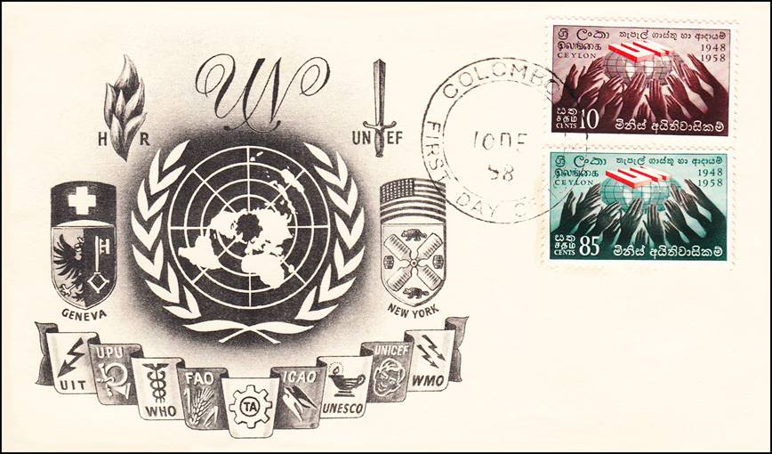 CEYLON (now Sri Lanka) First Day Cover issued on 10 December 1958. 10th Anniversary of UN Universal Declaration of Human Rights. |