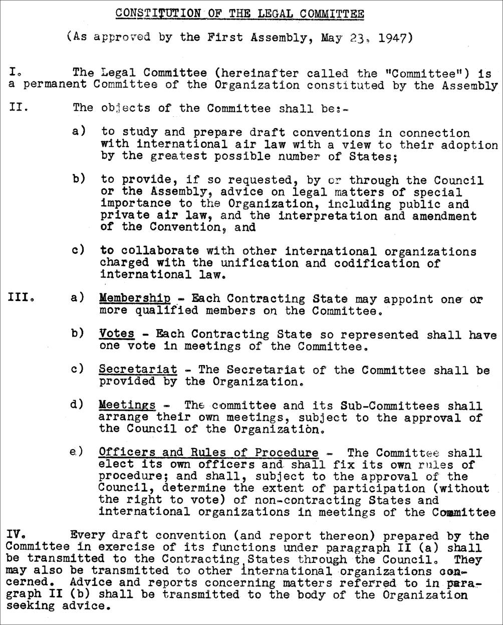 The 1st Interim Assembly of PICAO, held at Montreal from 21 May to 7 June 1946, adopted Resolution 31 foreseeing the establishment of a Permanent Committee on International Air Law (i.e., a Legal Committee) after the creation of ICAO. CITEJA fully agreed with the view of PICAO Assembly and held its last working meeting (i.e., the 15th Plenary Session) at Cairo from 14 to 19 November 1946, where it recommended that a Committee on International Air Law be established within ICAO. The 1st Session of the ICAO Assembly, held in Montreal from 6 to 27 May 1947, adopted Resolution A1-46 creating the Legal Committee as a permanent body of the Organization replacing the CITEJA. At the same time of the 1st Assembly, CITEJA held its final meeting and decided on its dissolution. Thus, the permanent Legal Committee came into being on 23 May 1947; it was a committee of the Assembly, but operated largely under the direction of the Council. It was comprised of legal experts appointed by the Member States. The Legal Committee held its first full session in Brussels from 10 to 25 September 1947. Since its establishment by the First Session of the ICAO Assembly in 1947, the ICAO Legal Committee has been at the forefront of studying air law issues, developing air law instruments and updating them as needed when circumstances change.