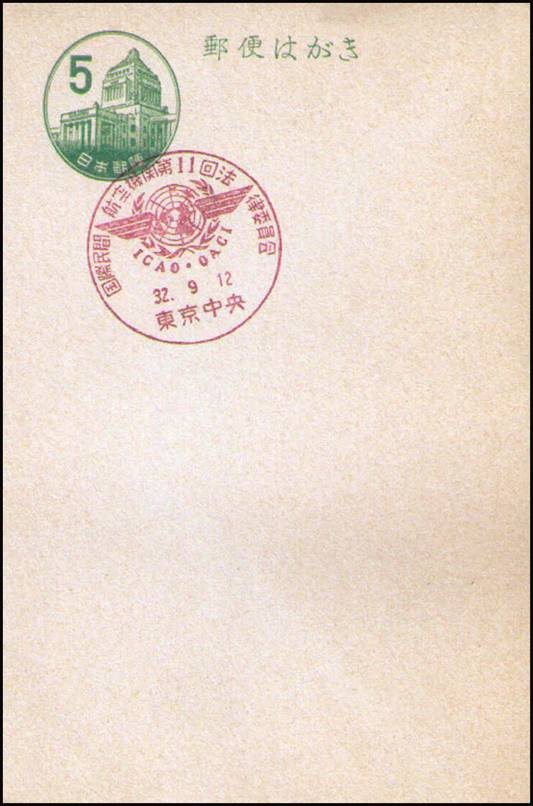 Tokyo, JAPAN - 12 to 25 September 1957 Stationery Card - Eleventh Session of the Legal Committee The picture in the green circle on the 5-yen postal card shows the Parliament Building in Tokyo. The cancellation is applied vertically, as the postcard is in portrait format. The postmark on the postcard show: 32. 9. 12. With the year 1873, the Gregorian calendar was introduced to Japan. While the Christian way of numbering years is commonly used in Japan today, a parallel numbering system was also frequently applied for years according to the reigns of emperors. The year 1957, which happened to be the 32nd year of the reign of the emperor Hirohito, also known as Emperor Shōwa (his reign started in 1926), was called Shōwa 32.