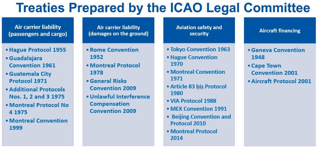 List of treaties prepared by the Legal Committee as of April 2022. Credit to Michael Gill, Director, ICAO Legal Bureau. |
