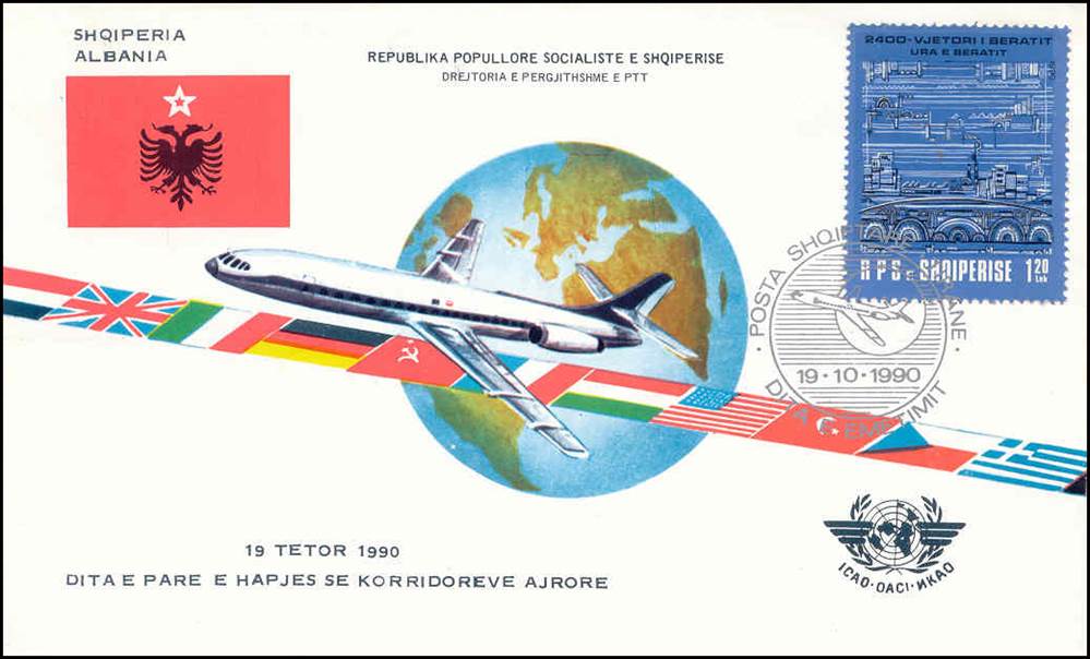 Albania - 19 October 1990 - Admission to ICAO The cover shows Albania’s national flag, the world map, a French Aérospatiale Sud-Est SE 210 Caravelle aircraft, and a runway of flags of countries having main air corridors/routes linking Albania with the rest of the word.