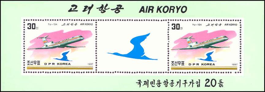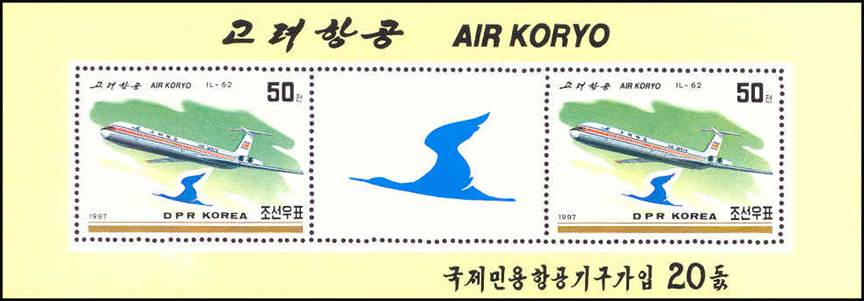 Democratic People’s Republic of Korea - 14 September 1997 20th Anniversary of admission to ICAO. Three sheet-lets of two stamps and a central label. See more information at the following link: Korea 1997.
