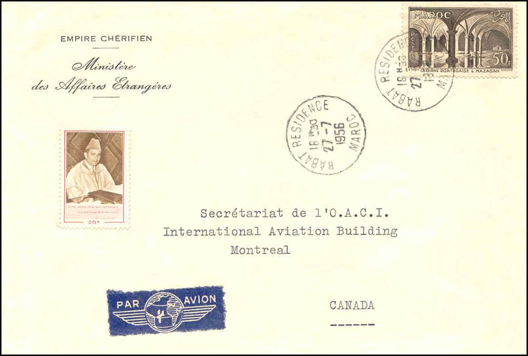 The postmark on the above cover, sent to the Secretariat of ICAO, is dated 27 July 1956; it still shows the characteristics of the French Protectorate, while Morocco's independence was proclaimed on 2 March 1956; Empire Cherifien is the old name, in French, for the Kingdom of Morocco before its independence. After winning independence in 1956, stamps with the name Maroc, issued before the independence (in the above example: in July 1955), remained in circulation for some time thereafter.