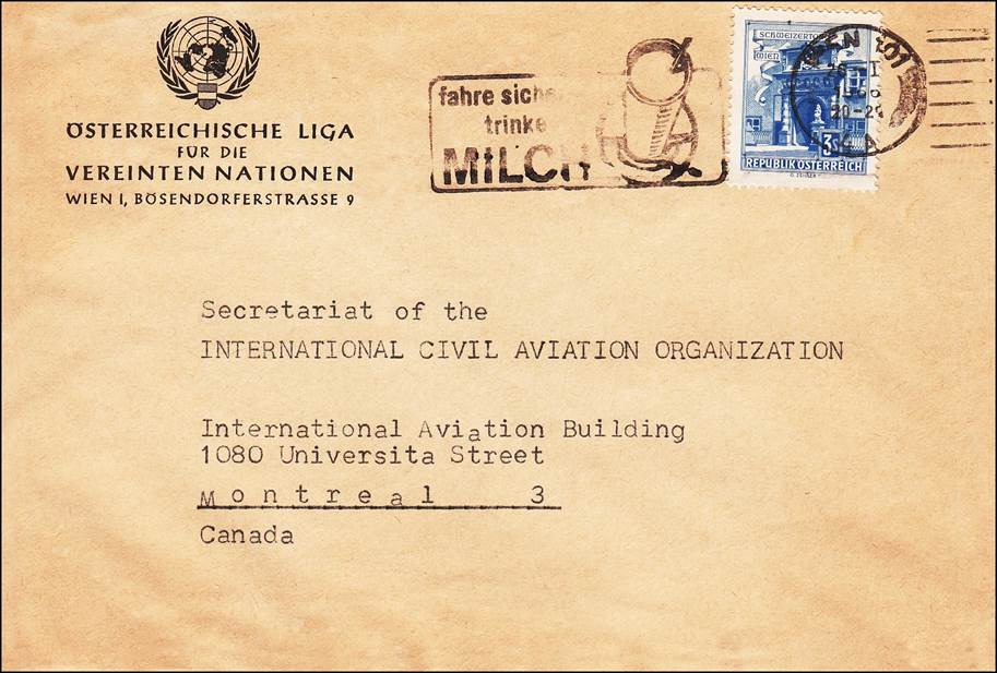 Service cover sent by the Österreichische Liga für die Vereinten Nationen to ICAO. Cancel dated 26 January 1966. The Austrian League for the United Nations was founded in 1945 in direct relationship with the United Nations itself as an interface between the UN and the Austrian population. Over the years, this League organized a variety of activities, such as lectures, exhibitions, concerts, tours, etc. In