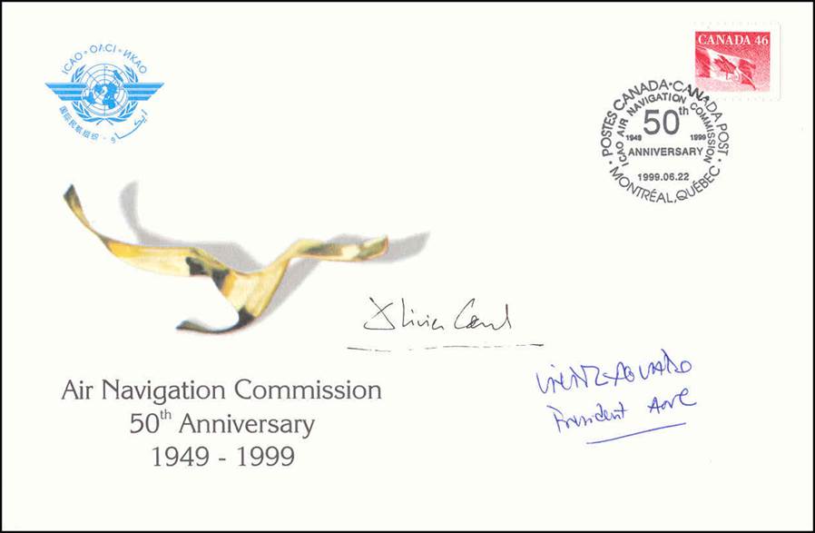 First day cover issued for the 50th anniversary of the Air Navigation Commission. The cachet shows the ANC Laurel Award. Autographed by Olivier Carel, first recipient of the Laurel award, and Victor Aguado the then President of the ANC. |
