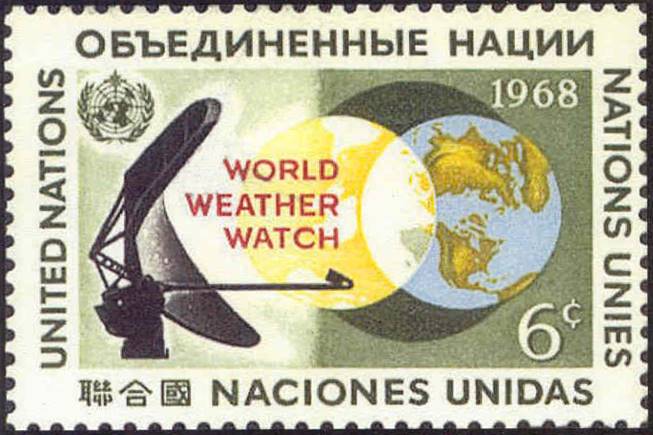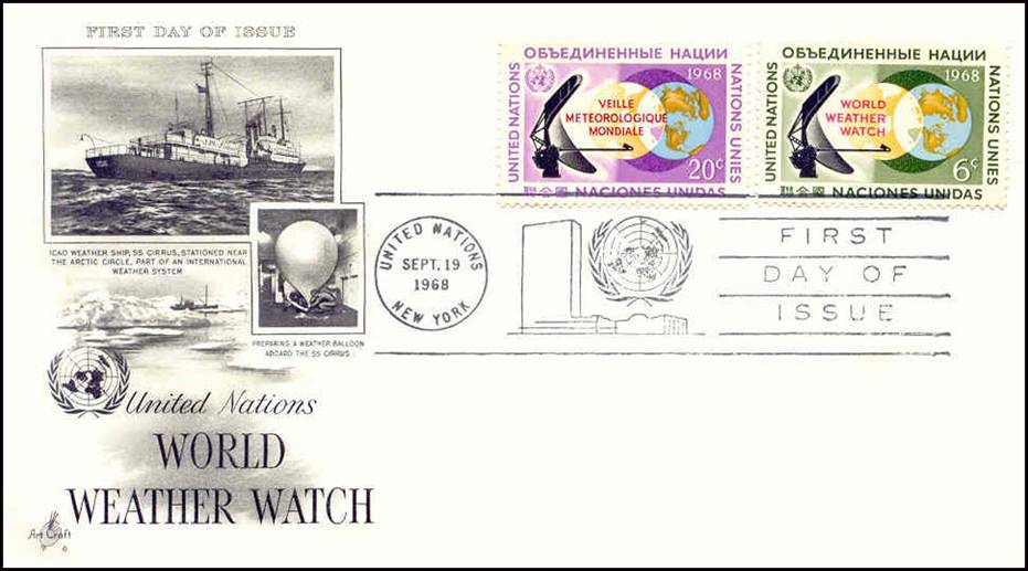 With pictures taken on the SS Cirrus, the above issue of 19 September 1968 commemorates the World Weather Watch (WWW) programme developed by the World Meteorological Organization (WMO), an Agency of the United Nations headquartered in Geneva, Switzerland. Established in 1963, the World Weather Watch -the core of the WMO programmes- combines observing systems, telecommunication facilities, and data processing and forecasting centres to make available meteorological and related environmental information needed to provide efficient services in all countries.