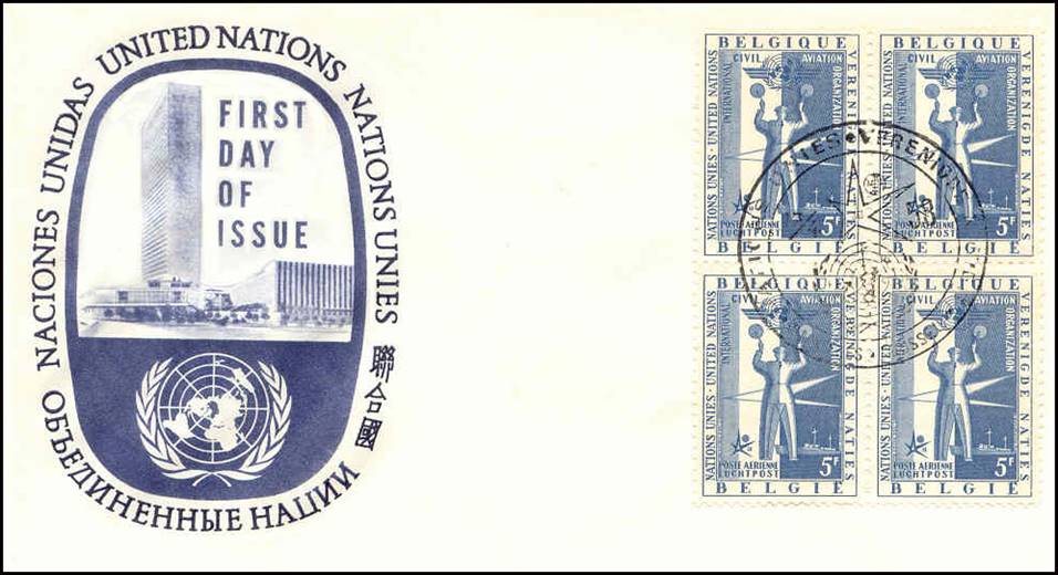 Belgium – 17 April 1958 - World’s Fair Expo 58 United Nations series issued for the purpose of financing the UN pavilion during the 1958 Brussels World Fair. In the background (bottom right): Oceanic navigation station ship.
