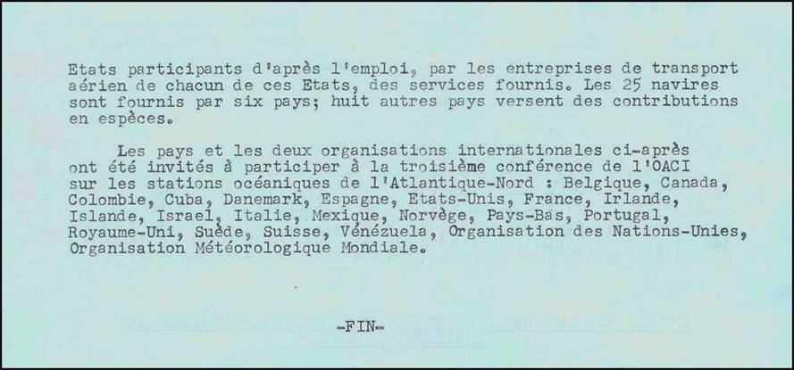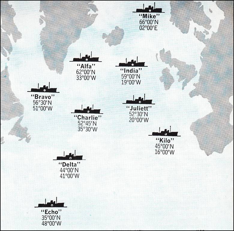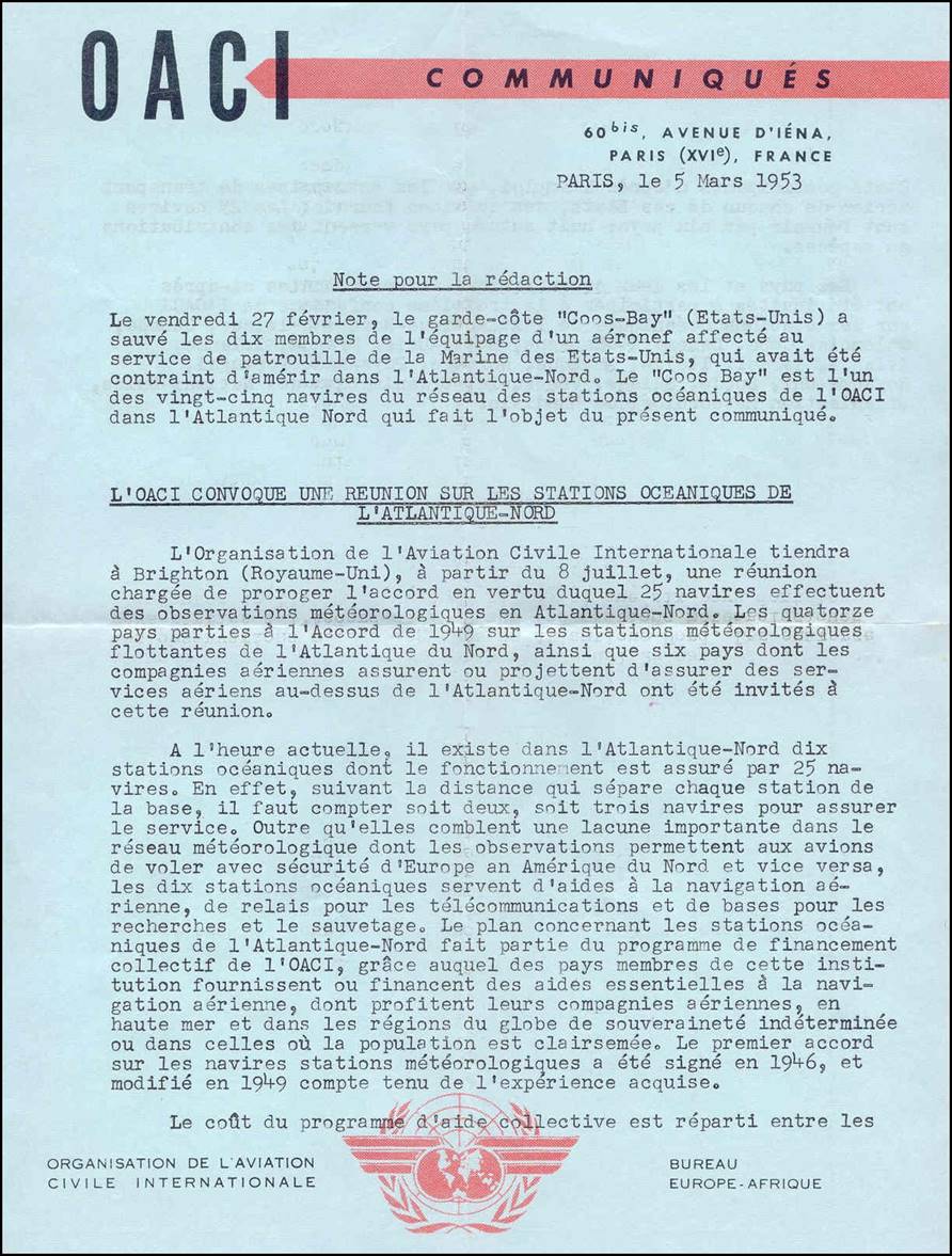 The recommendations of the PICAO Dublin Regional Meeting, held in March 1946, recognized that there was a serious lack of weather observation and air navigational facilities over the world’s most heavily travelled transoceanic corridor, i.e., the North Atlantic. Moreover, as underlying sovereign States had little to gain domestically in providing what would have been enormously expensive services for overflying international services, the Dublin meeting suggested that a network of ships be stationed at specific points to provide all necessary observations and communications relay points, and to serve as emergency air-sea rescue bases.