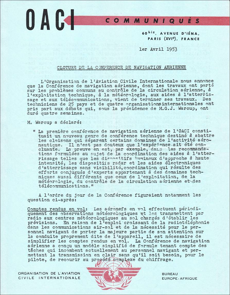 Newsletter released by the Paris Office announcing the Third Conference on North Atlantic Ocean Stations (NAOS) held at the Royal Pavilion in Brighton, England, from 8 to 15 July 1953. The agenda of the Brighton Conference was confined to the consideration of the reallocation of responsibilities and distribution under the existing Agreement.