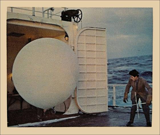 Excerpt from Le Journal de l’UNESCO (Le Courrier), Volume III, No. 10, Novembre 1950, Page 7. Weather balloon launching from the ship S.S. Cirrus under the ICAO Agreement named North Atlantic Ocean Stations (NAOS).