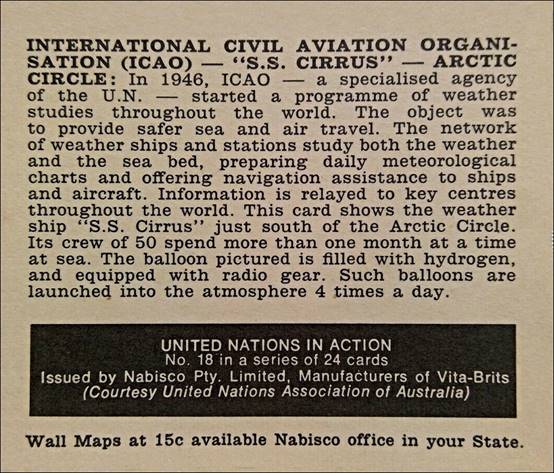 Weather ship S.S. Cirrus - Launching of the weather balloon filled with hydrogen and equipped with radio gear. Nabisco, manufacturers of Vita-Brits, in cooperation with the United Nations Association of Australia (UNAA), developed in 1969 a project named “The United Nations in Action” with a series of 24 cereal trading cards to help people to know more of this magnificent worldwide Organization. The above card No. 18 (recto and verso) is related to ICAO and the North Atlantic Ocean Ships. Nabisco (abbreviated from the earlier name National Biscuit Company) is an American manufacturer of cookies and snacks headquartered in East Hanover, New Jersey. The company is a subsidiary of Illinois-based Mondelēz International.