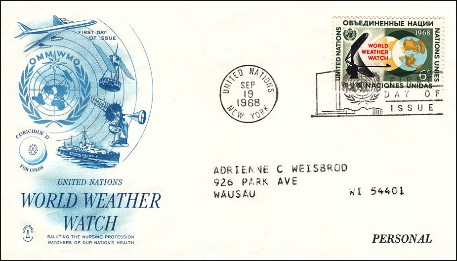 19 September 1968 – First Day Cover commemorating the World Weather Watch (WWW) programme. The cachet shows various elements of WWW global observing system, built upon existing subsystems (both surface- and space-based), i.e., ships, weather radars, satellites and aircraft. The inscription on the ship reads “STATION METEO. K”, referring the weather station K (Kilo), as organized under the ICAO Agreement named North Atlantic Ocean Stations (NAOS). This issue was sponsored by the Schering Laboratories. Marketed by Schering, Coricidin is used to alleviate coughs and includes chlorpheniramine for people with high blood pressure.