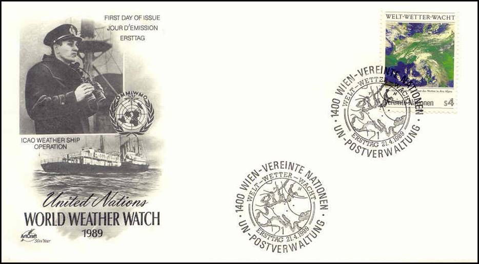 This issue of 21 April 1989 commemorates the 25th anniversary (although with one year behind the actual anniversary date) of the World Weather Watch (WWW) programme developed by the World Meteorological Organization (WMO). Pictures were taken on the SS Cirrus in 1962. |