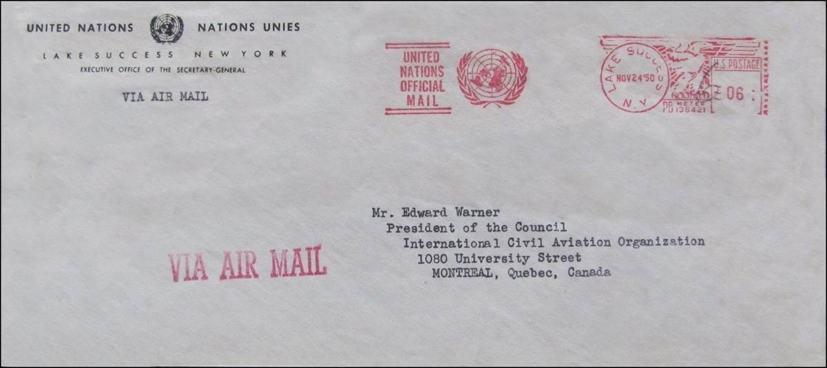 Service cover sent from the UN located at Lake Success to Dr. Warner. Postmarked on 24 November 1950. Prior to the construction of the current complex in New York City, the UN was headquartered, from 1946 to 1952, in a building that during World War II had been a Sperry Gyroscope Co. plant located at Lake Success, New York, an eastern suburb of the city in Nassau County on Long Island.
