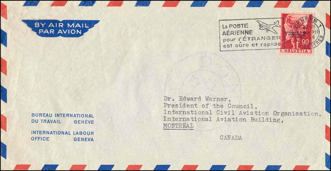 Mail sent to Dr. Warner on service cover from the International Labour Office, Geneva Postmarked on 14 November 1954.