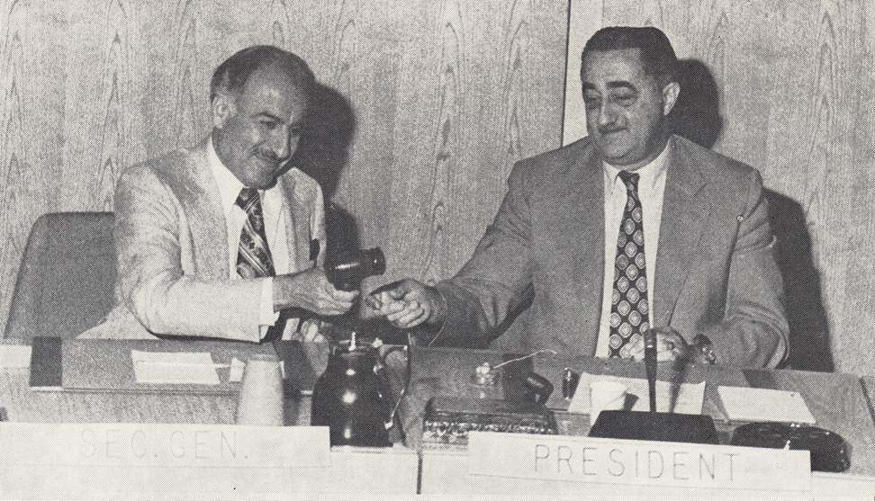 1957 - Mr. Binaghi passes the Council Chamber gavel to his successor, Dr. Kotaite.