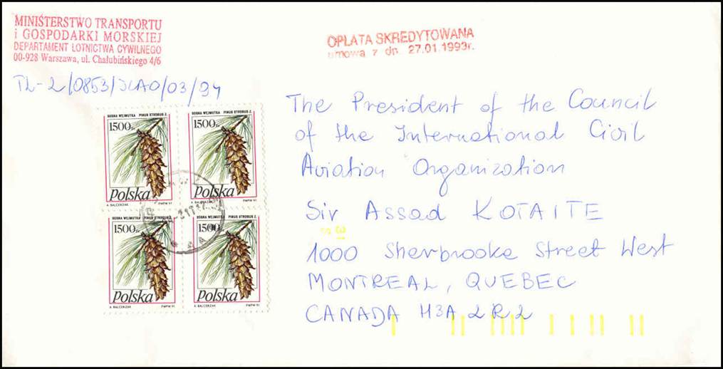 Mail sent to Dr. Kotaite from the Ministry of Transport, Warsaw, Poland Postmarked on 17 March 1994.