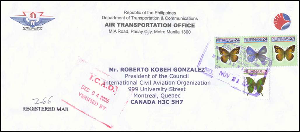 Mail sent to Mr. Roberto Kobeh Gonzalez from the Department of Transportation and Communications (DOTC), Manila, Philippines Postmarked on 21 November 2006 - Receiving stamp added by ICAO.