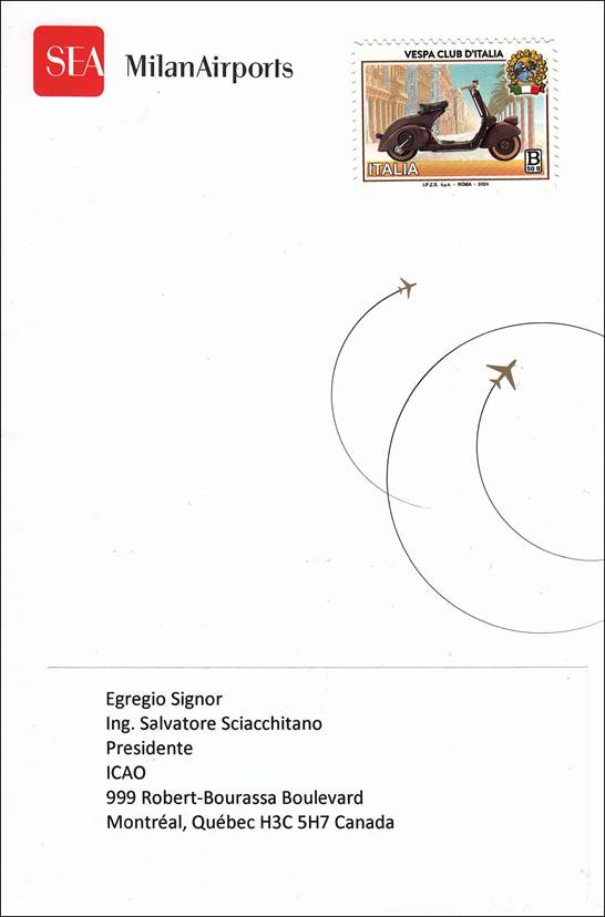 Service cover sent from the SEA GROUP to Mr. Salvatore Sciacchitano, President of the Council. The SEA Group manages the two main airports in Milan, Italy: Malpensa and Linate, both located in Lombardy. |