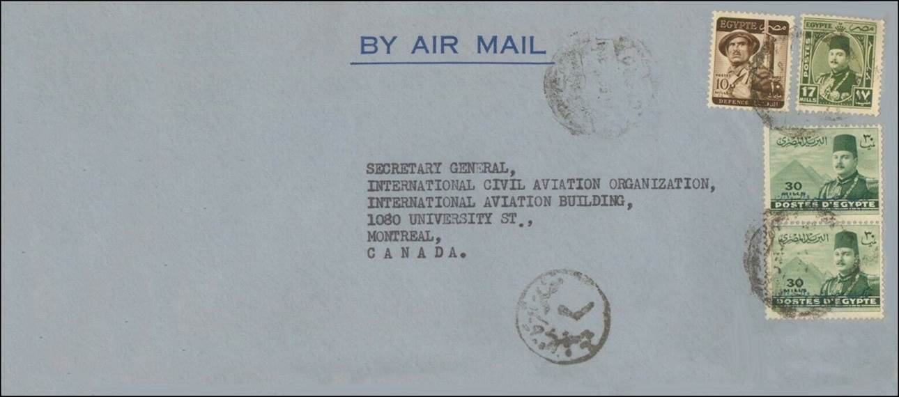Official correspondence sent from Cairo Office (in Zamalek, Cairo) to ICAO at Headquarters in Montréal, with the imprint of the International Civil Aviation Organization on the back flap. Dated 1953. The green stamps depict King Farouk.