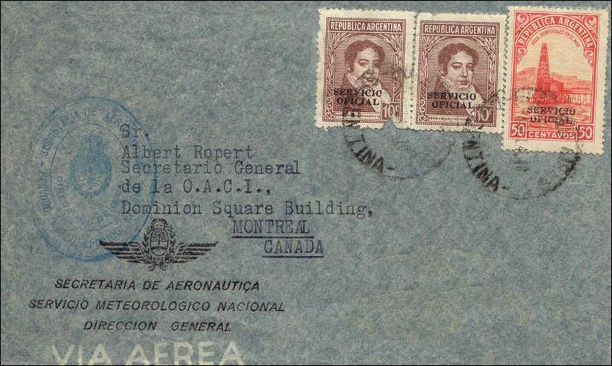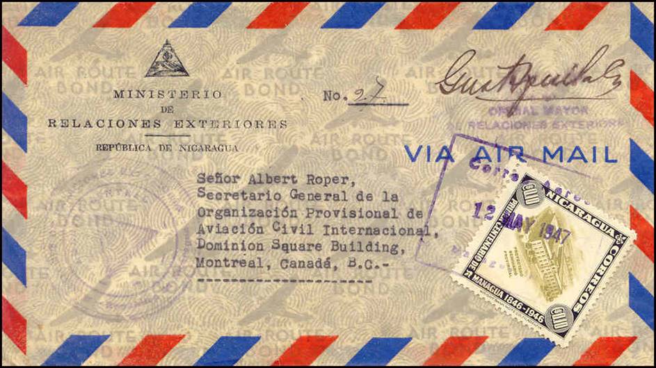 The above shows a commercial cover sent to Dr. A. Roper as Secretary General of PICAO, with a postmark dated 12 May 1947 (a few weeks after ICAO came into being); news regarding the establishment of the permanent ICAO had not flown fast enough to reach the ministries of all governments.