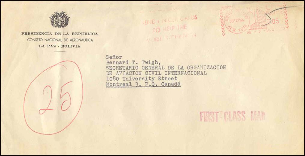 Service cover sent by the Presidency of the Republic of Bolivia to Mr. B.T. Twigt, Secretary General. Postmarked on 13 September 1965. Note the error in the spelling of the name.