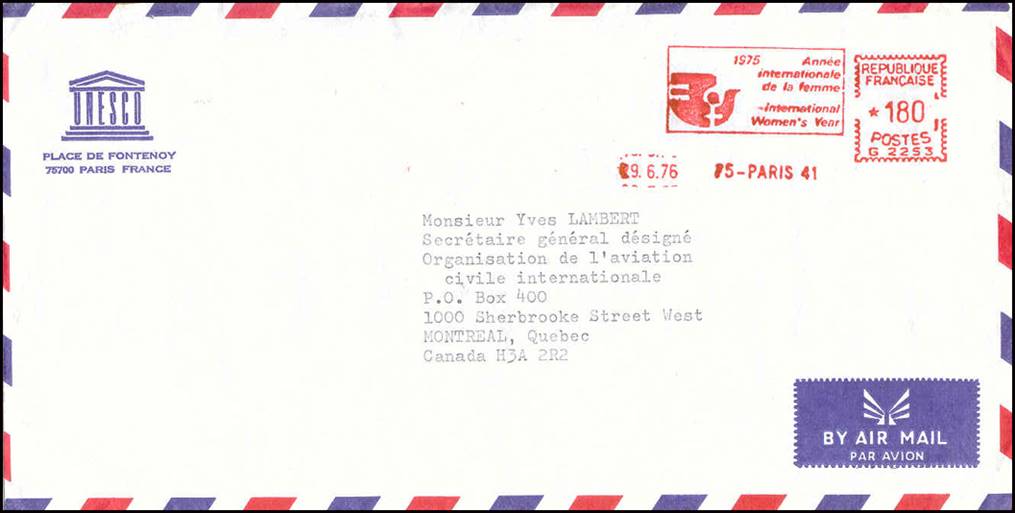 Service cover sent by UNESCO to Mr. Y. Lambert, Secretary General Designated. Postmarked on 29 June 1976.