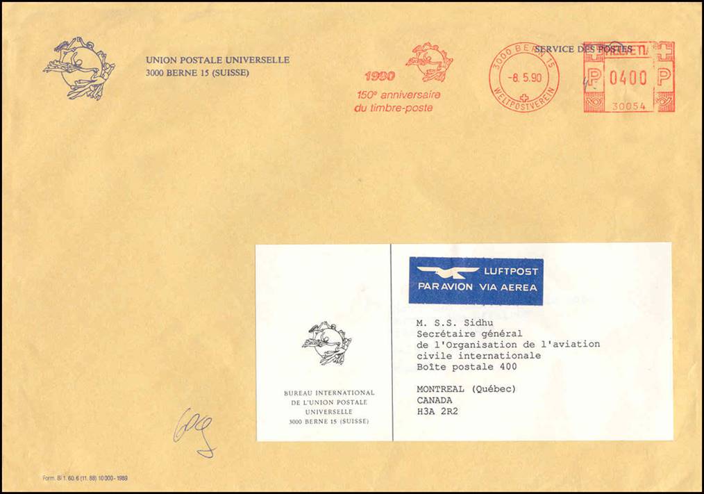 Service cover sent from UPU to Dr. S.S. Sidhu, Secretary General. Postmarked on 8 May 1990.