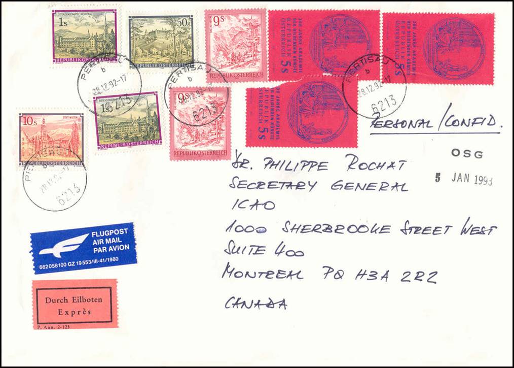 Cover sent to Dr. P.H.P. Rochat, Secretary General. Postmarked on 28 December 1992.