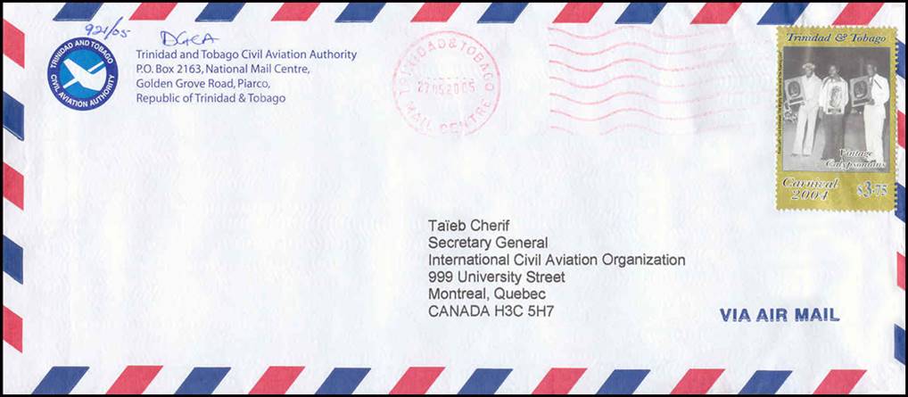 Cover sent from Trinidad and Tobago’s CAA to Dr. T. Chérif, Secretary General. Postmarked on 27 May 2005.