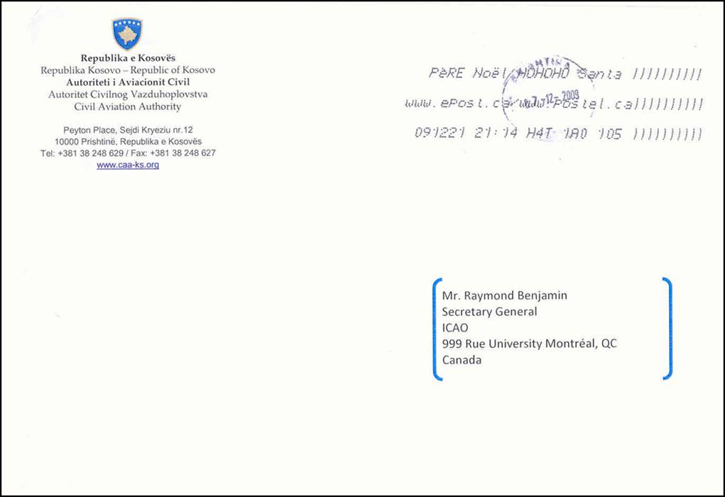 Cover sent from Kosovo’s CAA to Mr. R. Benjamin, Secretary General. Postmarked 7 December 2009. Note that the above stampless cover was postmarked in Kosovo on 7 December 2009, i.e., on the exact day of ICAO’s 65th anniversary. It was again postmarked at the entrance into Canada on 21 December 2009 by Canada Post (H4T 1A0 postal code, at the main sorting plant of MacArthur Street in the borough of Saint-Laurent, Montreal), which had developed a special postal code H0H 0H0, as per the following story. In 1974, staff at Canada Post’s Montreal office was noticing a considerable number of letters addressed to Saint Nicholas coming into the postal system, and those letters were being treated as undeliverable. Since those employees did not want the writers, mostly young children, to be disappointed at the lack of response, they started answering the letters themselves. The amount of mail sent to Santa Claus increased every Christmas, up to the point that Canada Post decided to start an official Santa Claus letter-response program in 1983. Approximately one million letters come into Santa Claus each Christmas, including from outside of Canada, and all of them are answered, in the same languages in which they are written. Canada Post introduced a special address for mail to Santa Claus, complete with its own postal code: SANTA CLAUS, NORTH POLE, H0H 0H0, CANADA. In French, Santa's mail is addressed to: PÈRE NOËL, PÔLE NORD, H0H 0H0, CANADA. H0H 0H0 was chosen for this special seasonal use as it reads as "Ho ho ho"....