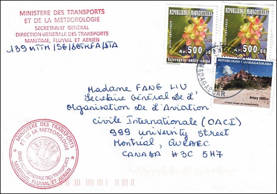 Service cover sent from the Ministry of Transport and Meteorology in Madagascar to Dr. Fang Liu. Postmark dated 28 October 2015. It is interesting to note that this cover was still addressed to ICAO at 999 University Street, although this street was renamed Boulevard Robert-Bourassa since 15 March 2015.
