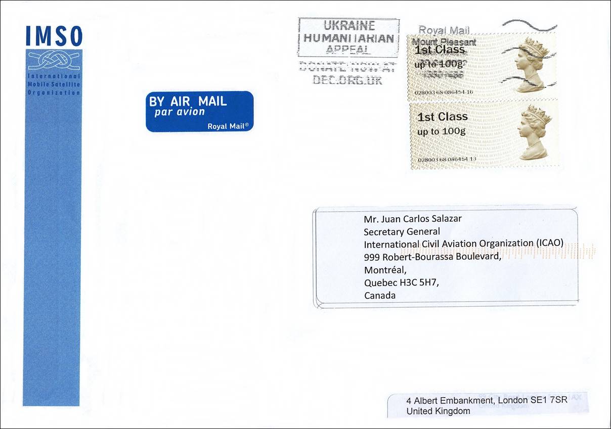 Service cover sent from the International Mobile Satellite Organization to Mr. Juan Carlos Salazar. |