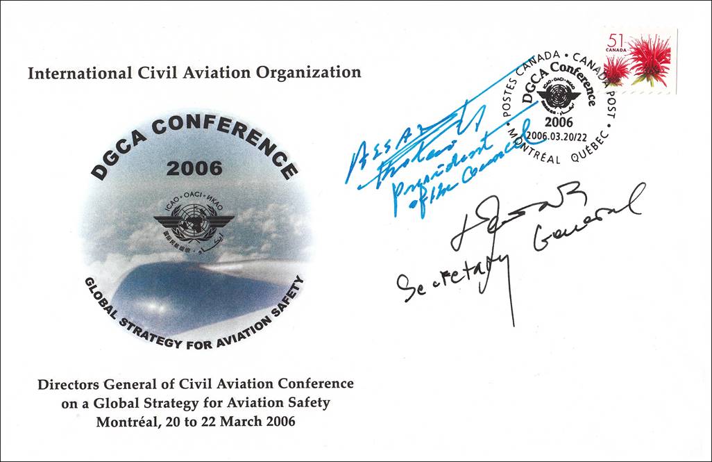 Commemorative cover issued for the Conference on a Global Strategy for Aviation Safety (DGCA/06) held in Montreal, Canada from 20 to 22 May 2006. The lower cover was autographed by Dr. Assad Kotaite, Chairman of the Conference and President of the ICAO Council, and Dr. Taïeb Chérif, Secretary General.