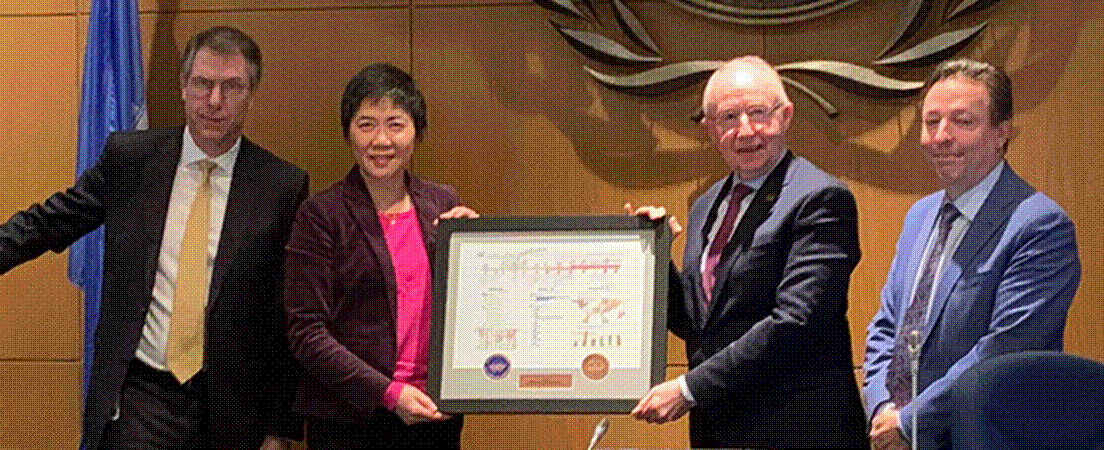 During a special ceremony conducted on 10 March 2020 at the fourth meeting of the ICAO Council’s 219th Session, ICAO Council President Salvatore Sciacchitano accepted a framed gift from ICAO Secretary General, Dr. Fang Liu, commemorating the 20th anniversary of ICAO’s Universal Safety Oversight Audit Programme (USOAP). Also present were Mr. Stephen Creamer (left) Director of the ICAO Air Navigation Bureau (ANB), and Mr. Denis Guindon, ANB Deputy Director of Monitoring and Oversight.