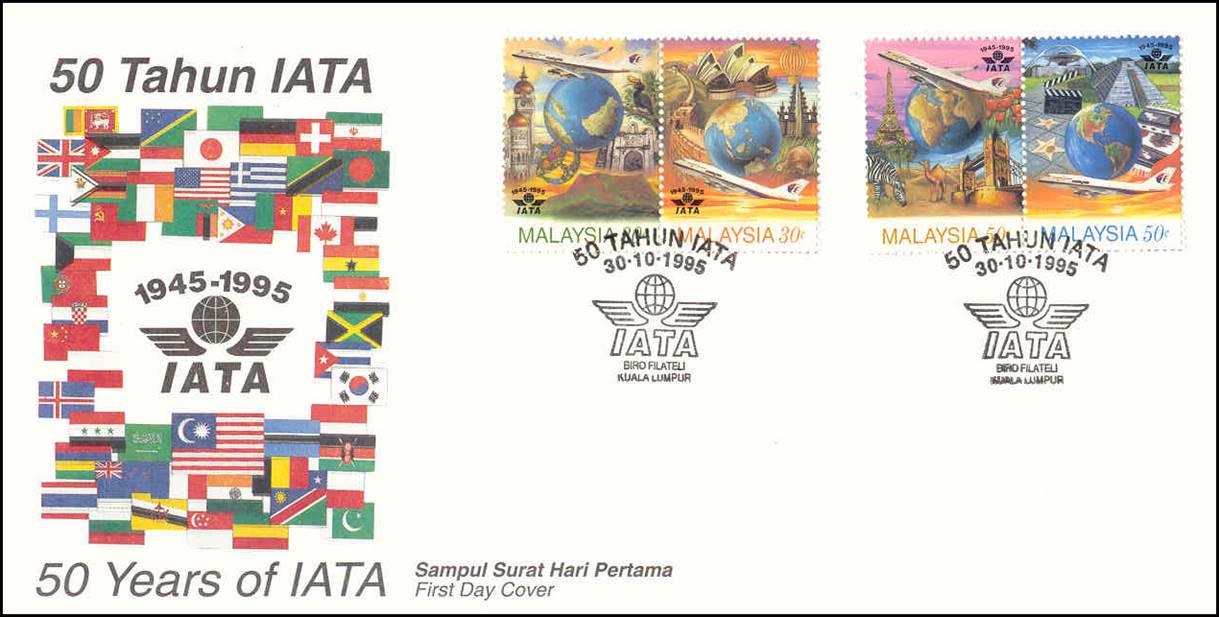Malaysia – October 1995 – 50th Anniversary and 51st Annual General Meeting (AGM) of IATA. The four stamps depict Malaysia Airlines' major destinations. The 30-sen se-tenant pair features a Malaysian background and the Asia/Australia/New Zealand destinations. The 50-sen se-tenant pair depicts Europe/Africa and the Americas. The IATA logo is prominently displayed in all four stamps.