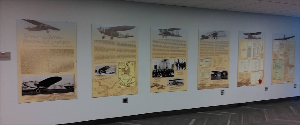 Panes of the exhibition displayed in the Conference Center at Montréal commemorating the 85th anniversary of the Warsaw Convention (2014). |
