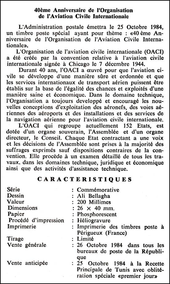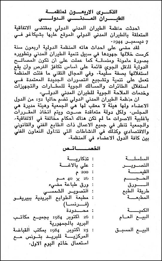 ICAO emblem; Interlocked peace dove and airliner (i.e., stylized bird and rear of an airplane); Text "40eme ANNIVERSAIRE / ORGANISATION AVIATION / CIVILE INTERNATIONALE" (also in Arabic). |