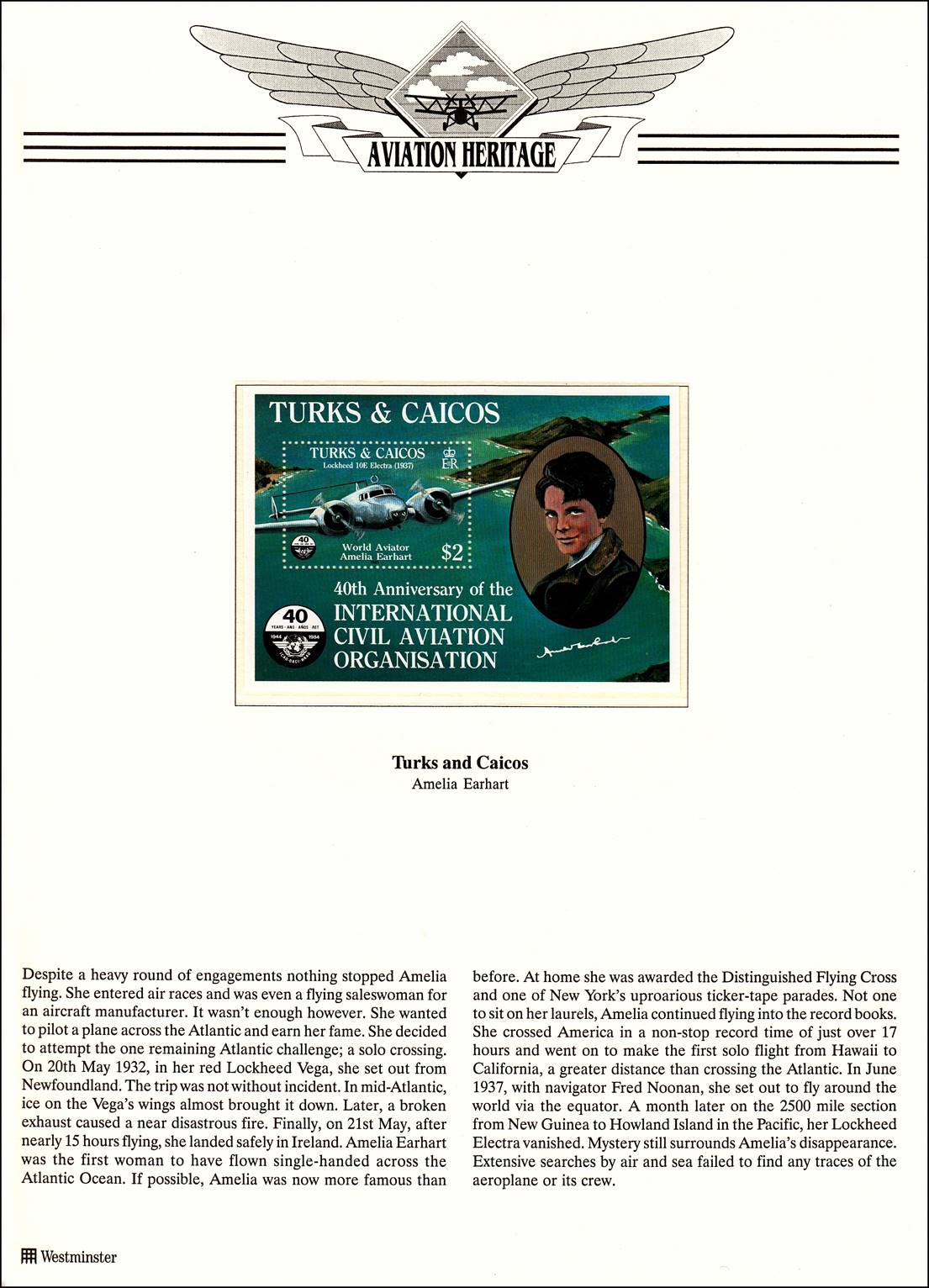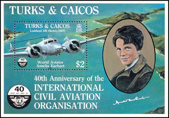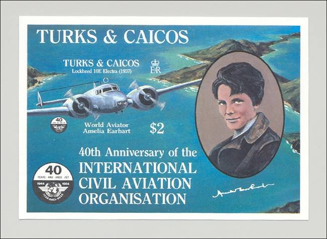 Miniature sheet: Amelia Earhart's Lockheed 10E Electra (1937). The Organization’s name is printed with s instead of z. The correct name is: International Civil Aviation Organization. |