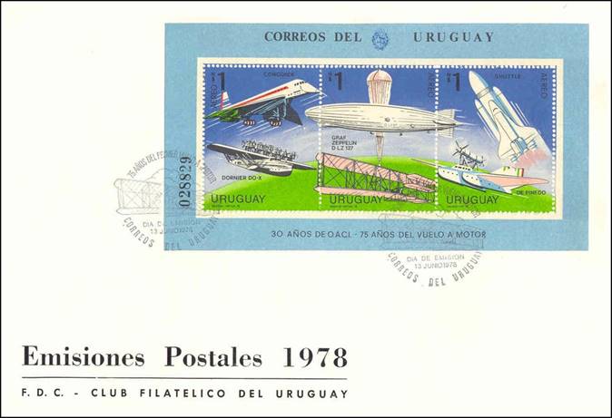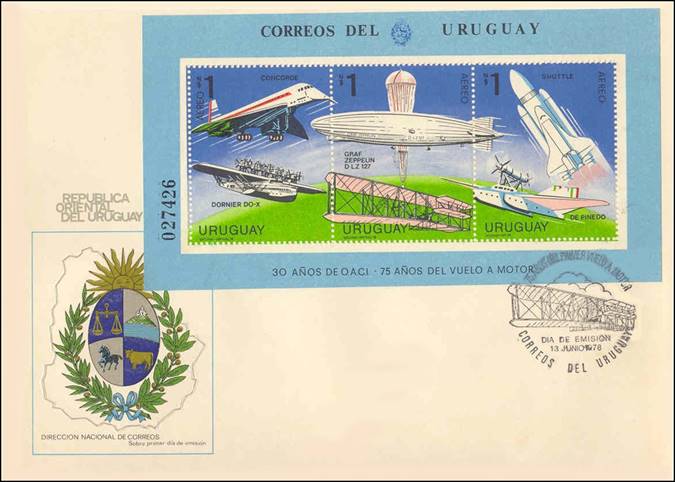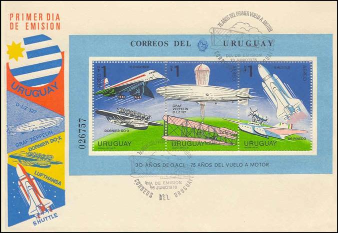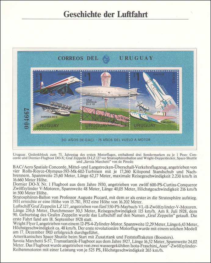 This sheet presents a real mini-history of flight-related topics and shows three stamps valued at 1 Nuevo Peso (N$); from left to right: 1. Concorde and Dornier Do X from Lufhansa, registered D-1929. The Dornier Do X was the largest, heaviest and most powerful flying boat in the world when it was produced in 1929 by the Dornier Company of Germany; it was powered by twelve radial engines in tandem mountings. On 20 June 1931, it landed for the first time in Rio de Janeiro, Brazil, where the crew was greeted by the local German communities. 2. Graf Zeppelin D‑LZ 127, stratosphere balloon and double decker Wright Flyer I. The Graf Zeppelin LZ 127 (Registered D-LZ127, Deutsches Luftschiff Zeppelin #127) flew on 30 June 1934 over Montevideo, Uruguay on the return flight from Argentina to Brazil; it was the only time the LZ 127 came to Buenos Ayres, Argentina. 3. Columbia Space Shuttle and Savoia-Marchetti of de Pinedo. Control number printed sideways in the left margin. Coat of Arms of Uruguay at the top-centre. |