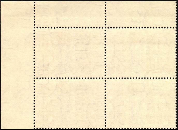 Imperforated corner block of four stamps, with light blue and olive colours missing. An extremely rare specimen print of the blue steel plate.