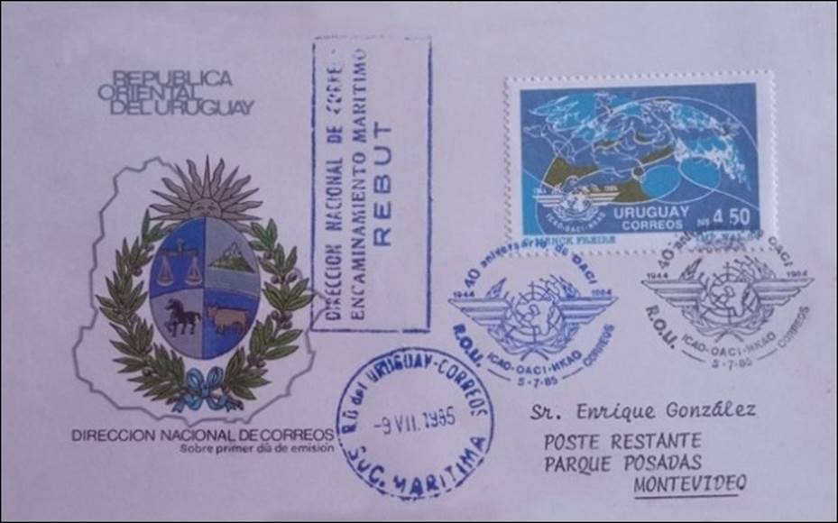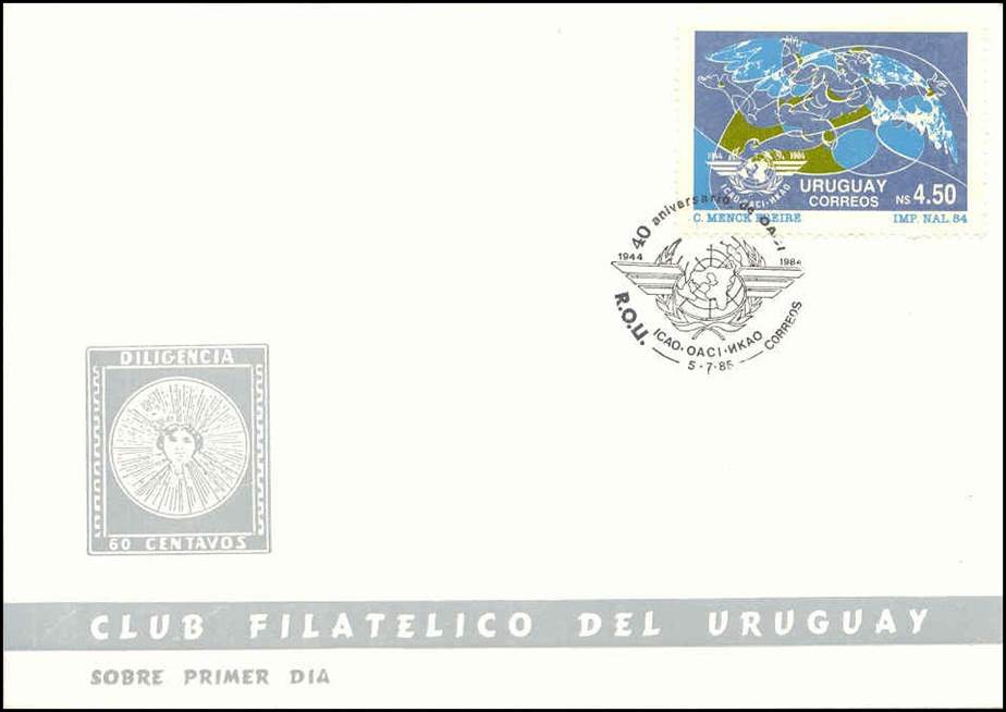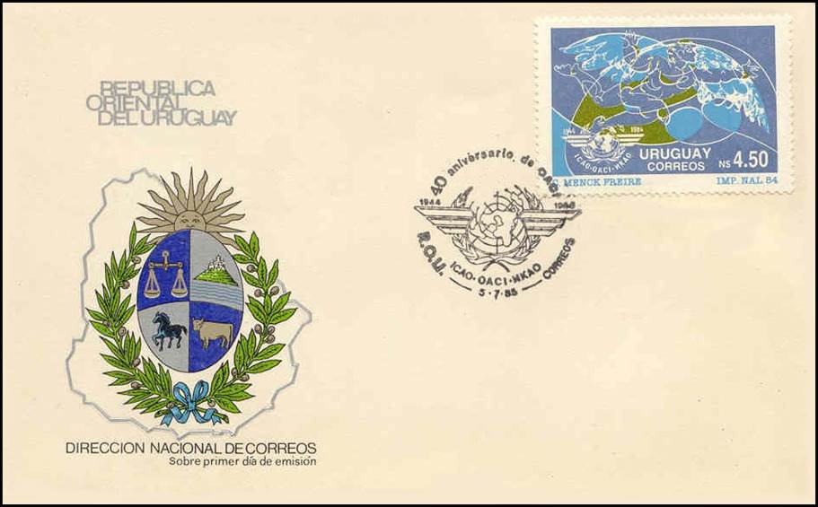 First Day Covers (FDC). The ICAO emblem shown on the postmark is incomplete and is a reproduction of the one depicted on the stamp. R.O.U. means República Oriental del Uruguay; the Oriental Republic of Uruguay is named after its geographic location to the east of the Uruguay River. As for the word Uruguay, it comes from the Guarani language, meaning river where the painted birds live.