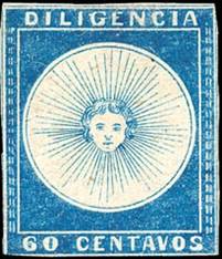The first stamps issued in Uruguay were ordered by the Administrator General of Posts, Atanasio Lapido, who also happened to be in charge of the stage coach service. They could be considered as a private issue, but must have had official status. The inscription "Diligencia" means "Stage coach" and indicates the means of transporting of the mail. They were only valid for mail within Uruguay. Picturing a radiant sun, the 60-centavos blue stamp shown here was used for single-page letters. The postal services organized by the stagecoach companies started issuing stamps on 1 October 1856.