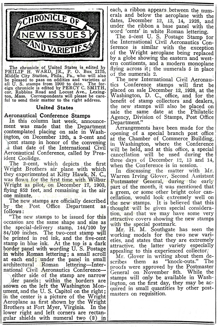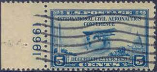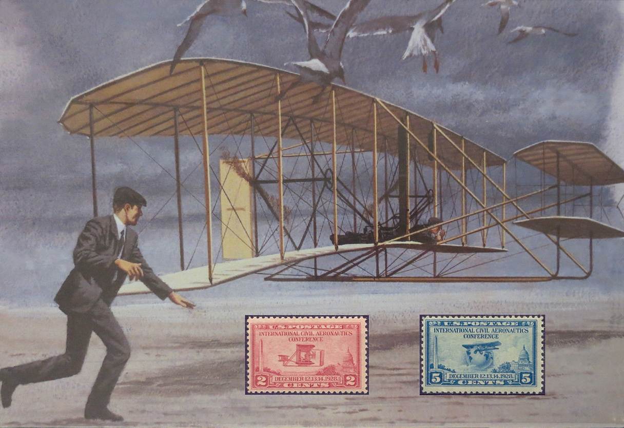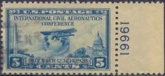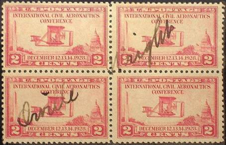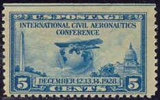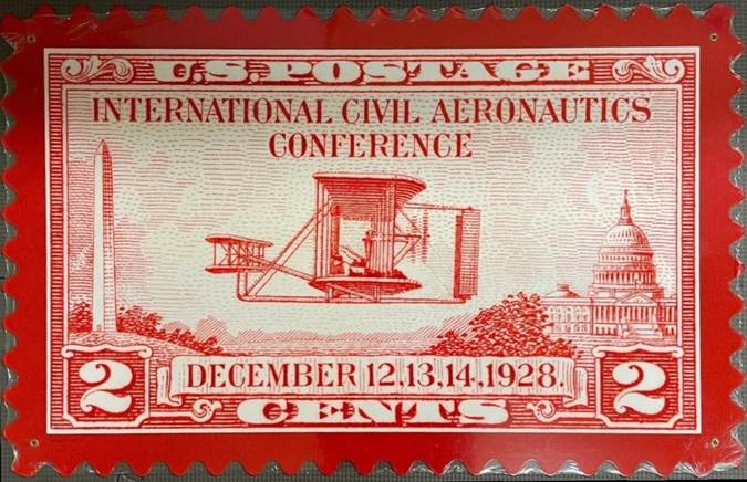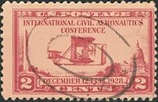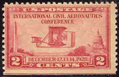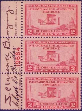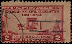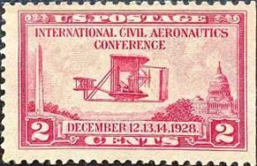 The design of the 2-cent red purports to be the original 1903 Wright Aeroplane, based on a photograph provided by the National Museum; however, Aero-postal Cover Expert Albert C. Roessler was quick to point out that the design was based on the 1908 later version of the Wright Airplane. A.C. Roessler became one of the philately’s first outspoken critics of the stamps and stamp designs of the Post Office Department. Roessler questioned everything and railed about most everybody. Roessler was the first important US airmail stamp and cover dealer; he left a mountain of material that is now eagerly sought and avidly appreciated. More background information on the Conference can be found by clicking on: 1928: The International Civil Aeronautics Conference.