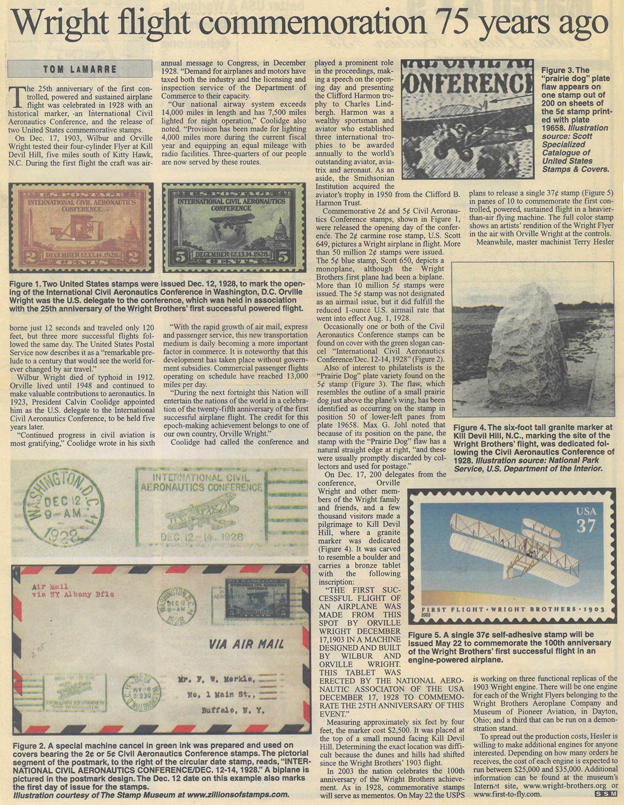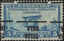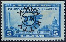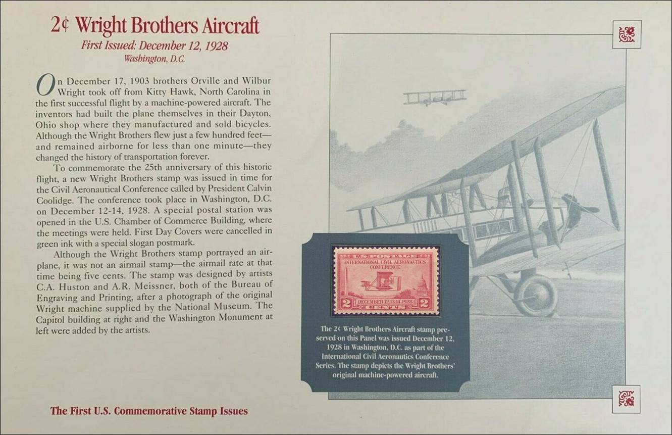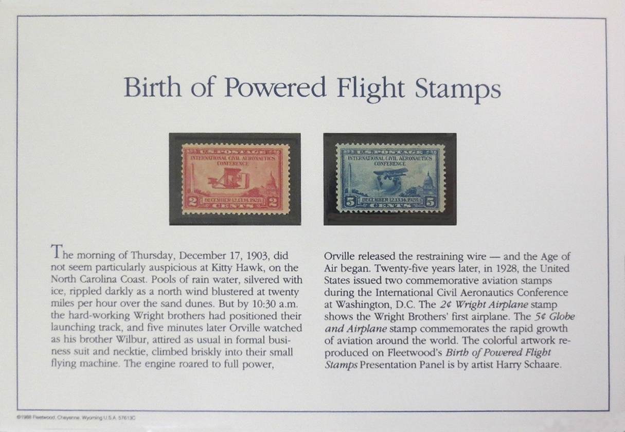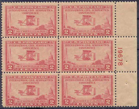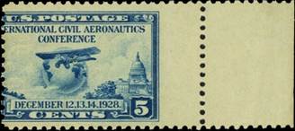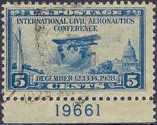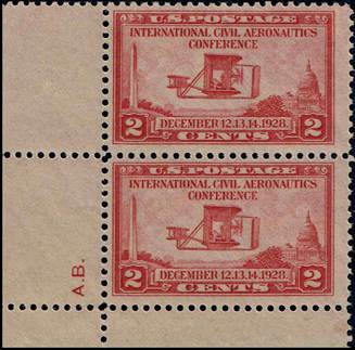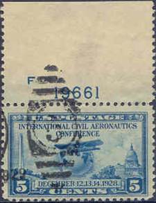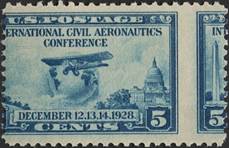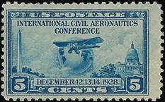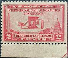 Background: This set was issued for the International Civil Aeronautics Conference called by President Coolidge for 12-14 December 1928, cancelled at a special postal station set up in the U.S. Chamber of Commerce Building, Washington, D.C., where the meetings were held. The conference also commemorated the 25th anniversary of the Wright Brothers' successful manned flight at Kitty Hawk (17 December 1903). The stamps were notable for the following reasons: 1. They represent the first time the Post Office celebrated the Wright Brothers' achievements; 2. They were issued from a non-postal facility, a rare occurrence in 1928; and 3. The first day cancellations were applied in green, the first-time non-black ink was used for first day postmarks by machine. At the top of the stamps, is a dark border panel with the wording: U.S. POSTAGE in white Roman lettering, a small scroll at the end; under the panel in small Roman architectural lettering: INTERNATIONAL CIVIL AERONAUTICS CONFERENCE; on each side of the stamps are narrow border panels. A ribbon appears between the numerals 2 or 5 with the dates DECEMBER 12, 13, 14, 1928 and under the ribbon is a base panel with the words CENTS in white Roman lettering.
