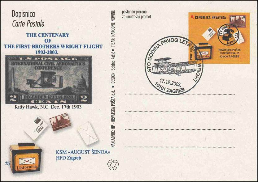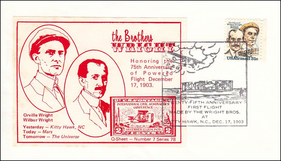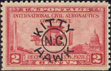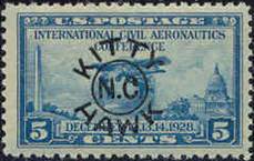 Legendary New Jersey stamp Dealer-Publisher-Cachet Maker Albert C. Roessler (1883-1952) added his own tribute to the Wright brothers by privately overprinting KITTY HAWK with N.C. inside a circle. He overprinted the stamps as a sales gimmick soon after they were issued. These overprints occasionally turn up in albums, confounding collectors who could not find information about them in mainstream postage stamp catalogues. Roessler was careful not to try to use the overprints for postage, as postal rules forbade the use of defaced stamps to pay postal rates. The inverts are also known.