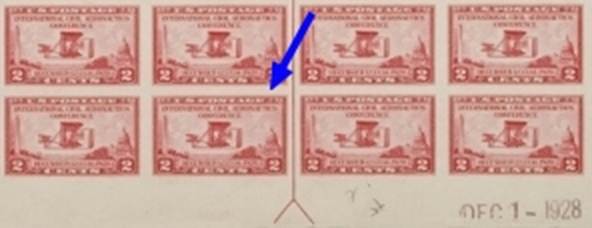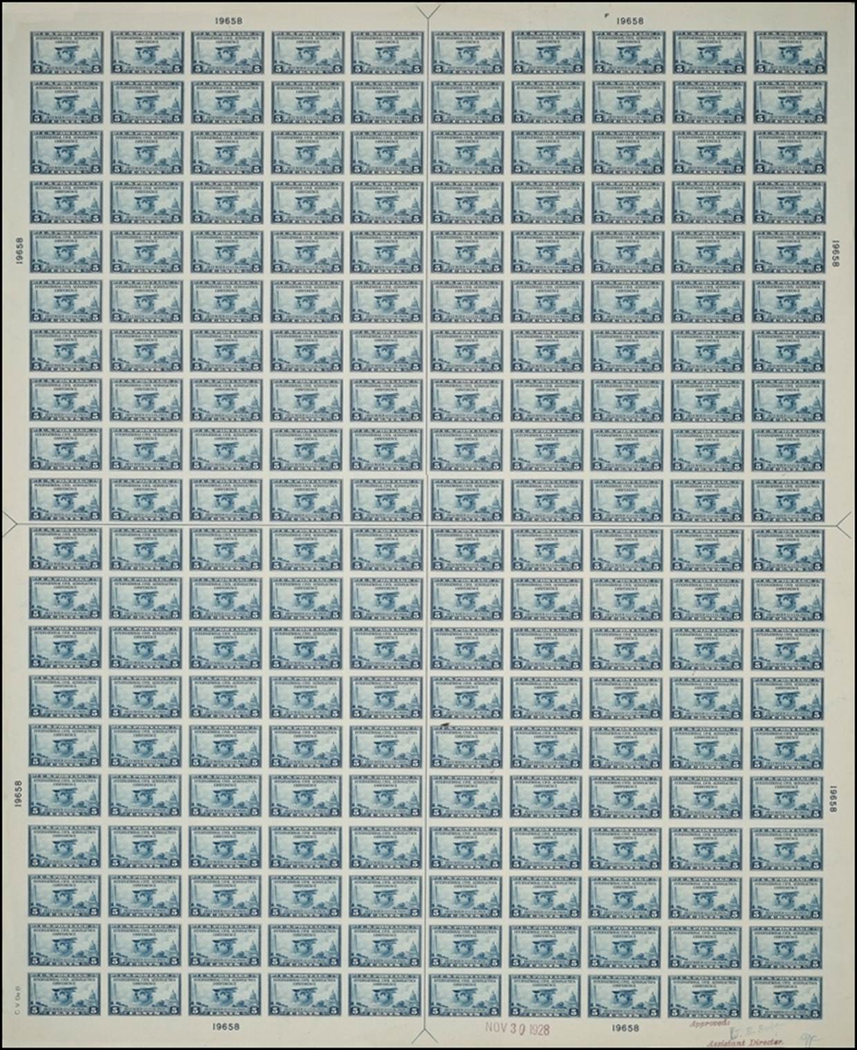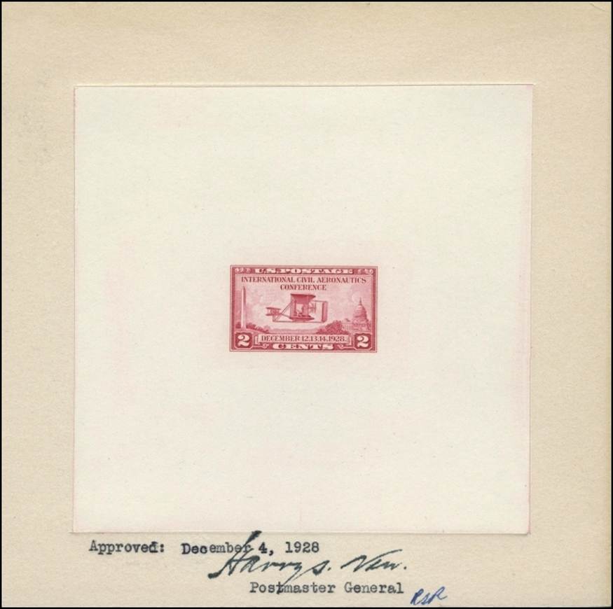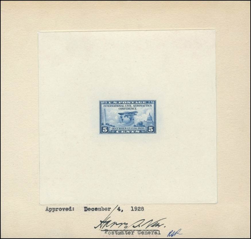 Plate proofs for the 5-cent stamp were approved on 30 November 1928 while the 2-cent plate proofs were certified on 1 December. Large Die Proofs (see below) were approved by Harry Steward New, Postmaster General (a former Senator, who served as Postmaster General under Presidents Warren G. Harding and Calvin Coolidge) on 4 December 1928 and Third Assistant Postmaster General Robert Regar. |