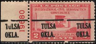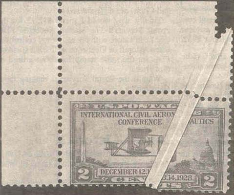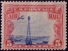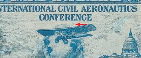 The Prairie Dog plate variety may be found on the 5-cent stamp. The flaw, which resembles the outline of a small prairie dog just above the plane’s wing, has been identified as occurring on the stamp in position 50 of the lower-left panes from plate 19658 (one stamp out of 200). Because of its position on the pane, the stamp with the Prairie Dog flaw has a natural straightedge at right; these were usually promptly discarded by collectors and used for postage.