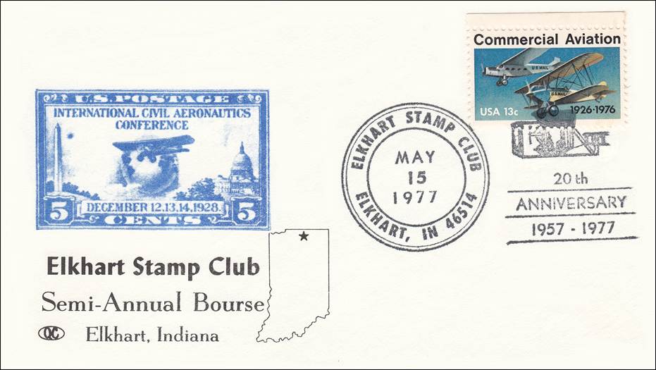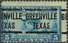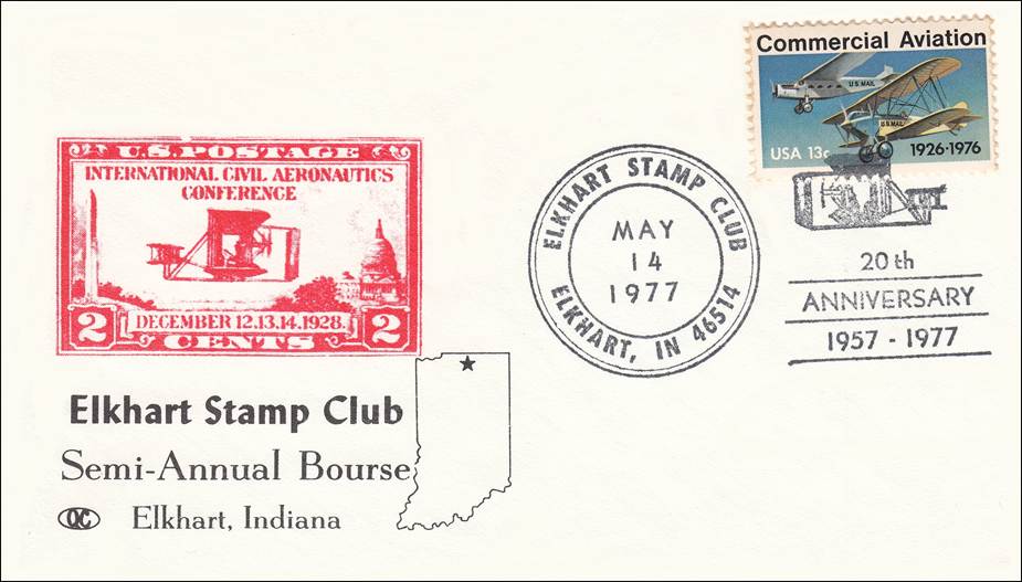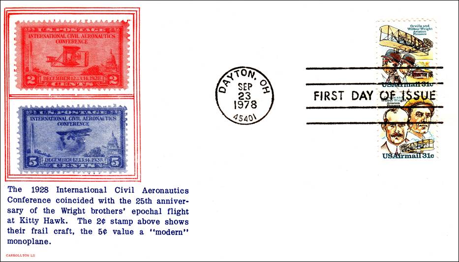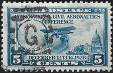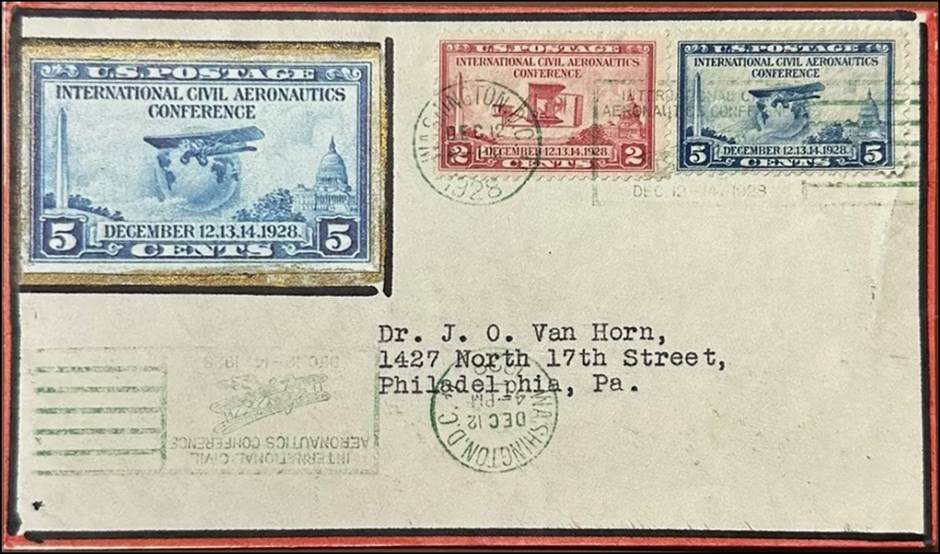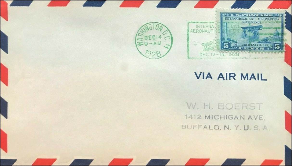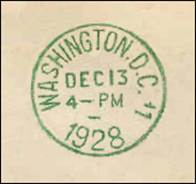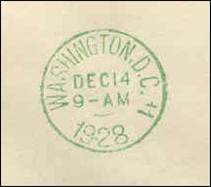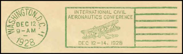 Covers cancelled during the 3-day Conference received a special green machine slogan containing the words INTERNATIONAL CIVIL AERONAUTICS CONFERENCE / DEC 12-14, 1928. Postmark (Washington, D.C.) with dates ranging from 12 to 14 December 1928. This was the first time an ink other than black was used for a first day machine cancellation. (Colored hand cancellations had previously been used on first day covers prepared for the Valley Forge commemorative of 1923 and a few others). The aircraft in the slogan is the Wright Brothers Flyer. The time on the postmark is usually: 9 AM; in some instances, one may find: 4 PM.