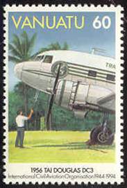 Douglas DC-3 of Transport Aérien Intercontinental, TAI (1956) at Bauerfield International Airport, Port Vila. In 1956, Transport Aérien Intercontinental (TAI), in a joint operation with Air France, introduced the Douglas DC-3 and DC-4 aircraft to Vanuatu. This service operated for two years, principally between Santo, Port Villa (Bauerfield Airport) and Noumea from where connections to the world aviation network were readily available. |